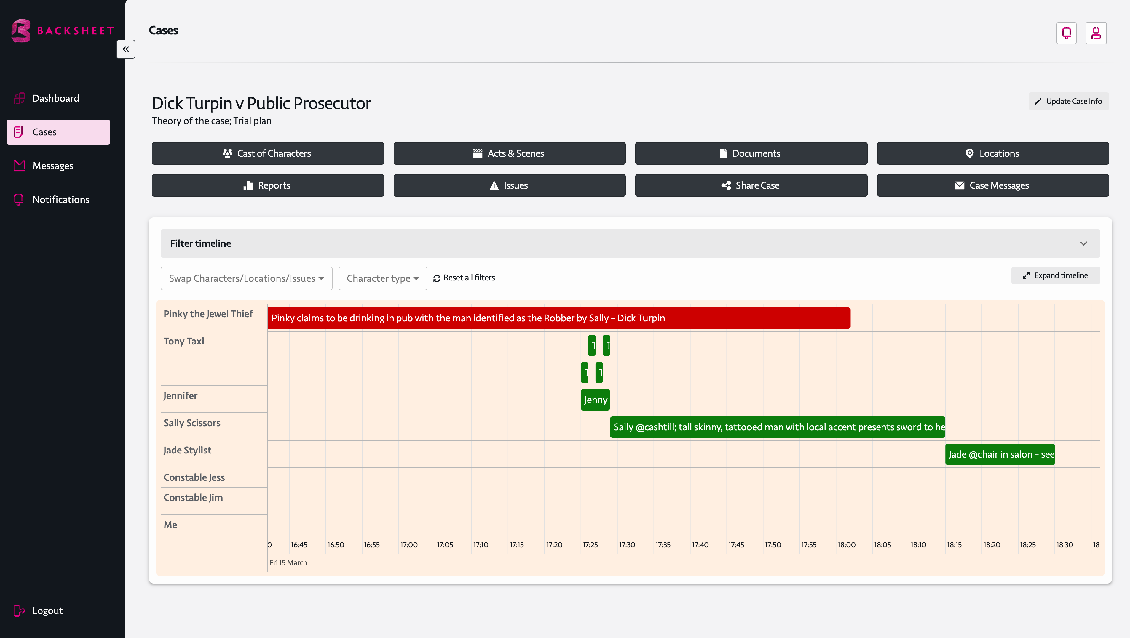 The key features of BACKSHEET are a timeline and the use of the timeline to view a case through three dimensions – (location) where a character (witness) is when an event took place, (the ‘issues’) the issues for proof, which the witnesses were party to at a certain place and time and, the life of a witness or an exhibit traced throughout the life of the case on the timeline; you can create a story arc for a character or exhibit, from beginning to end, to tell your client’s story. And you can share that digital work product with a colleague who is a subscriber at the press of a button.