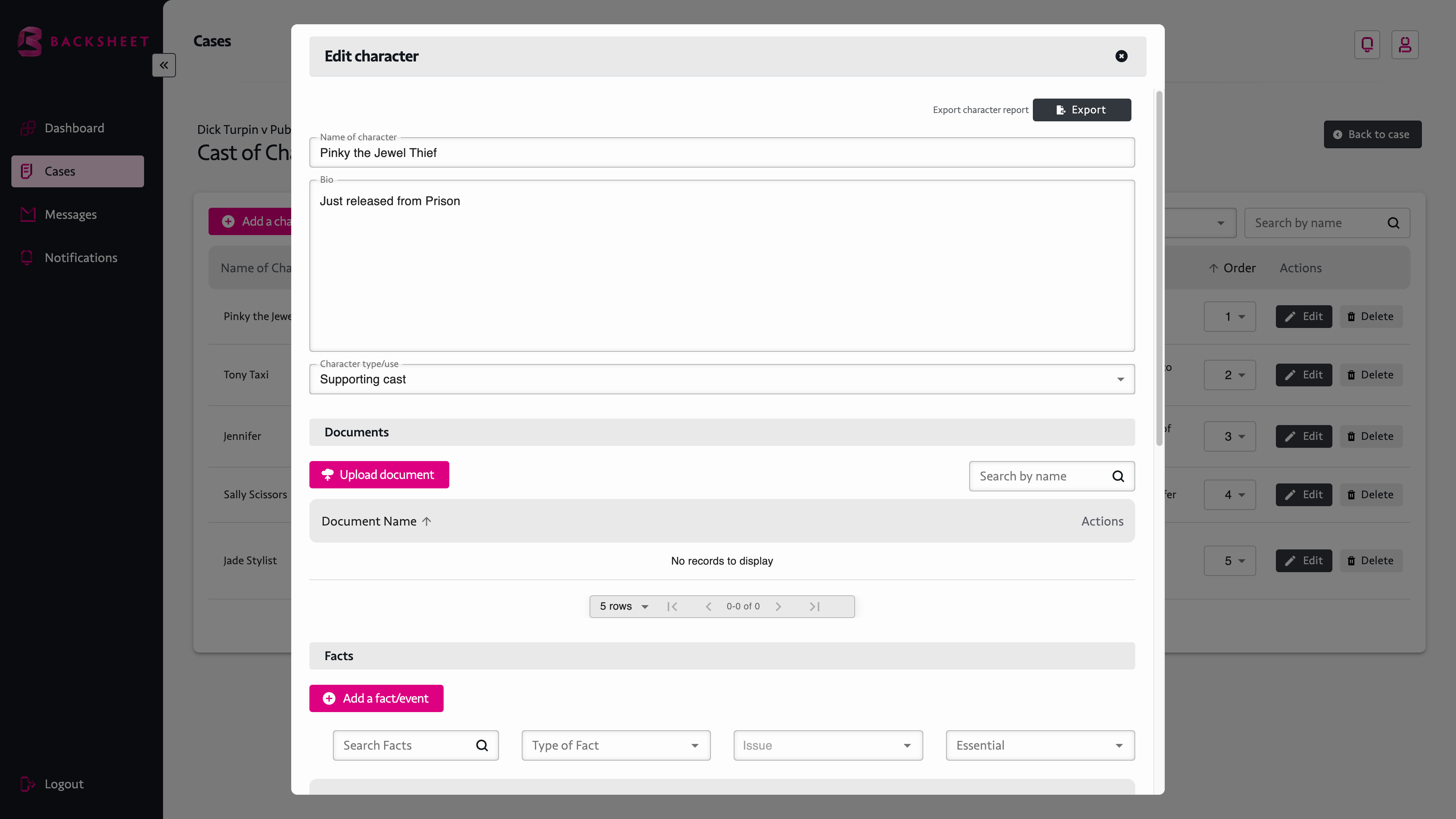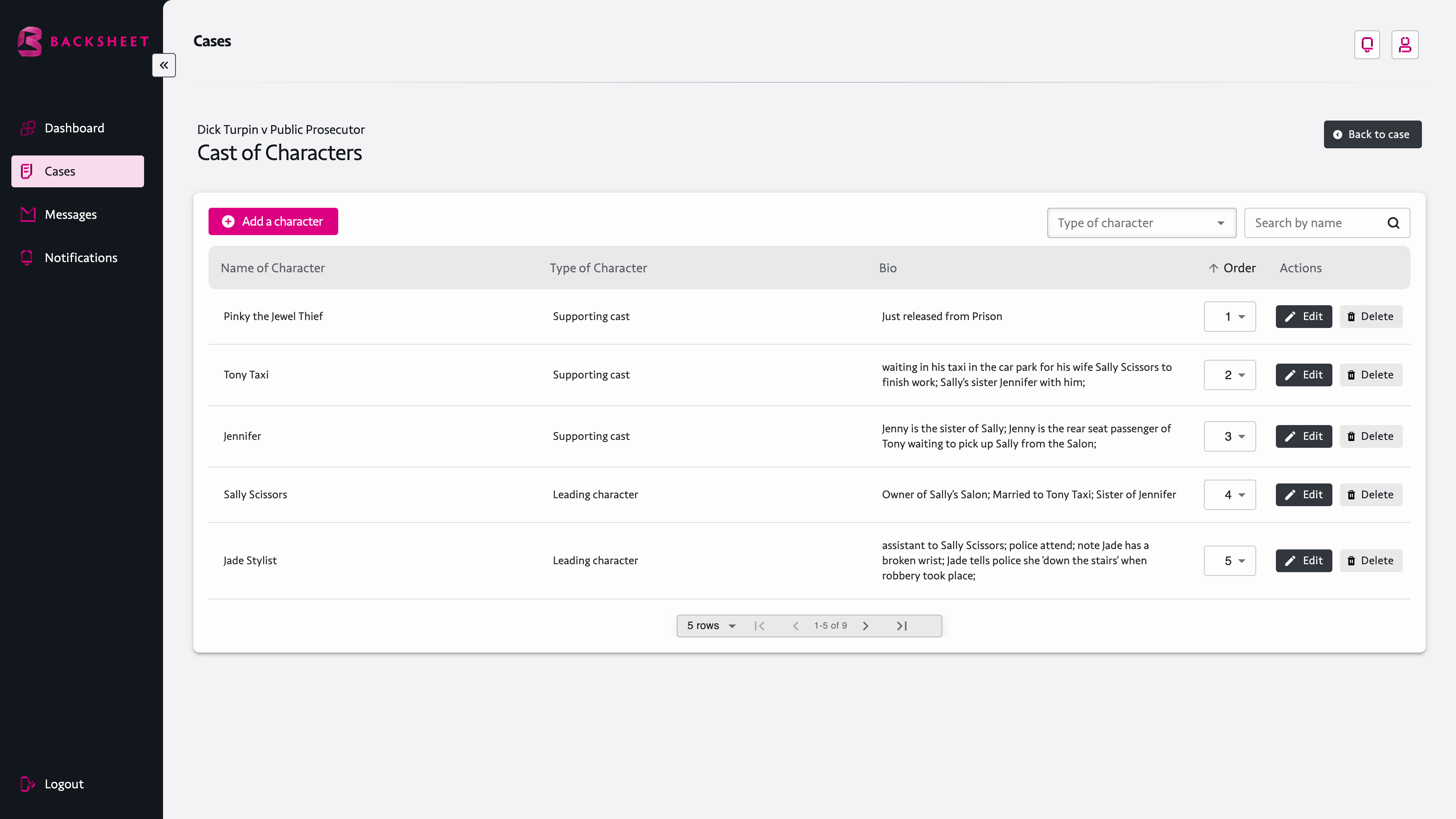 You will come to a new page which has the name of the case at the top, the description, ‘Cast of Characters’ and a bright pink button “+Add a Character” – you will see that once added it will show the name of the character, the type of the character a Bio and the witness can be ordered by number.
