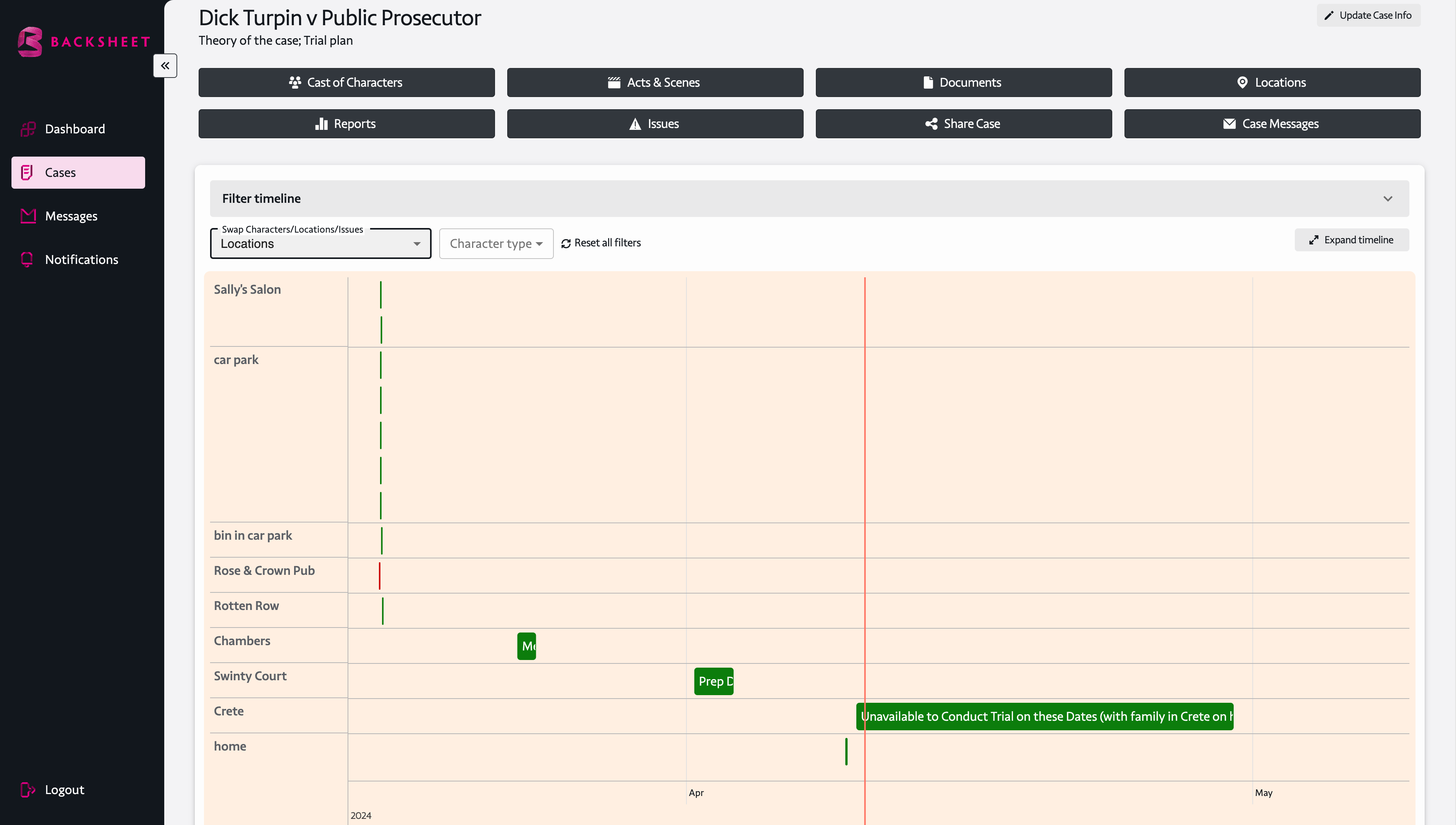 The ‘building blocks’ of the case are the ‘tabs’ – ‘Cast of characters’; ‘Acts & Scenes’; ‘Documents’; ‘Locations’; ‘Reports’; ‘Issues’; ‘Share Case’; ‘Case Management’. These are the building blocks for the timeline of the case.