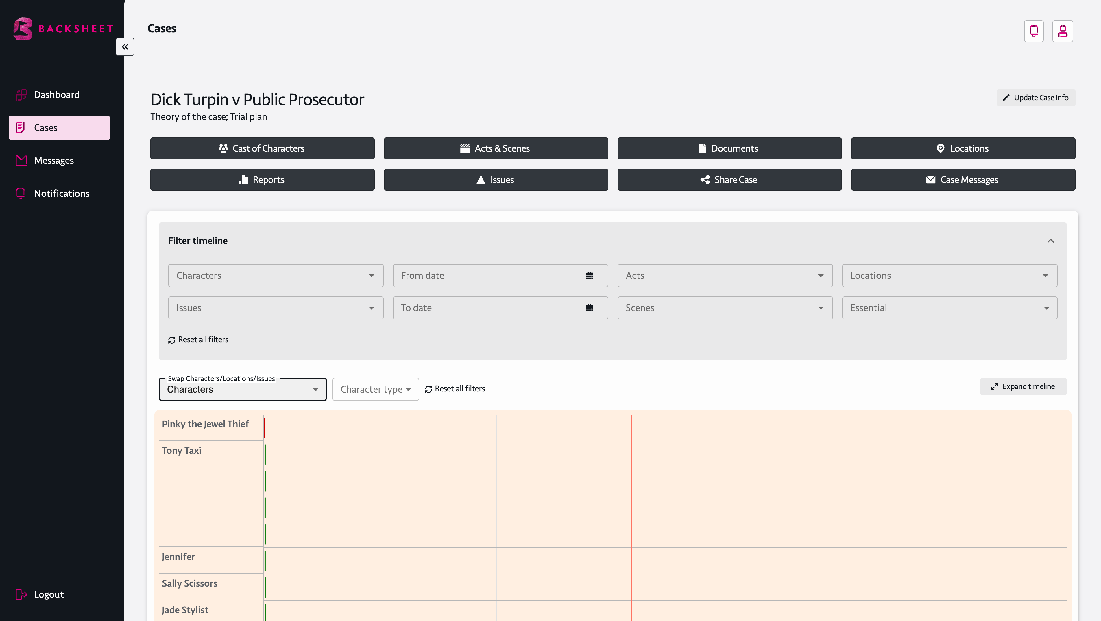 The filters in the boxes below the building blocks (‘Cast of characters’; ‘Acts & Scenes’; ‘Documents’; ‘Locations’; ‘Reports’; ‘Issues’; ‘Share Case’; ‘Case Management’ ) which are ‘characters’; ‘from date’; ‘Acts’; ‘Locations’; ‘Issues’; ‘To Date’; ‘Scenes’; ‘Essential Facts’ are filters to let the user see what is available to them from the ‘building blocks’ on the time-line.