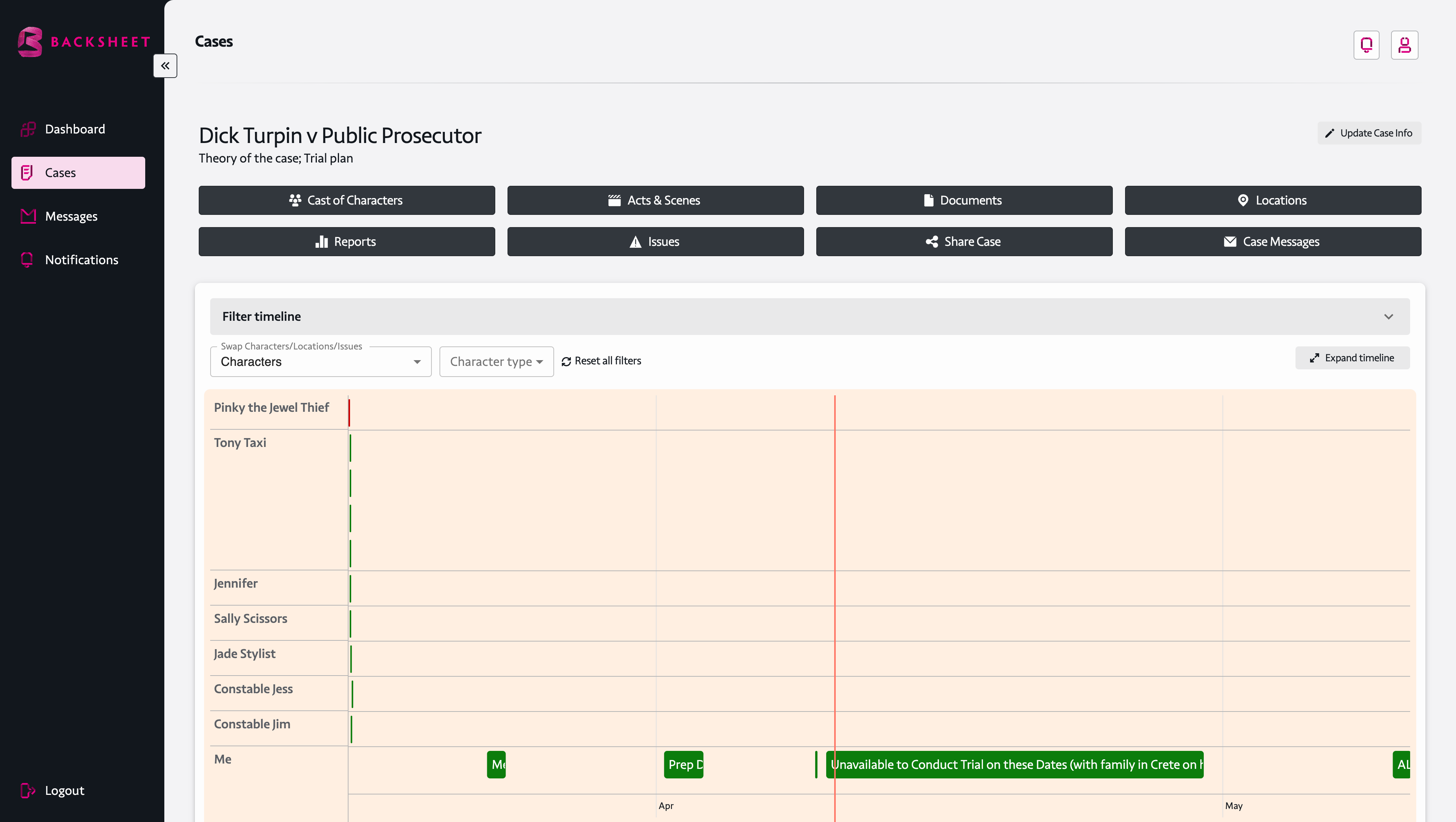 If you choose, you can use BACKSHEET to choreograph your trial as a director of a screenplay might. The timeline lets you set out the order you will call your witnesses in, and it lets you put your witnesses into an ‘Acts & Scenes’ format: you can divide the action into acts and scenes in the same way a playwright would carry the narrative and action of his play for the intended audience through the players.